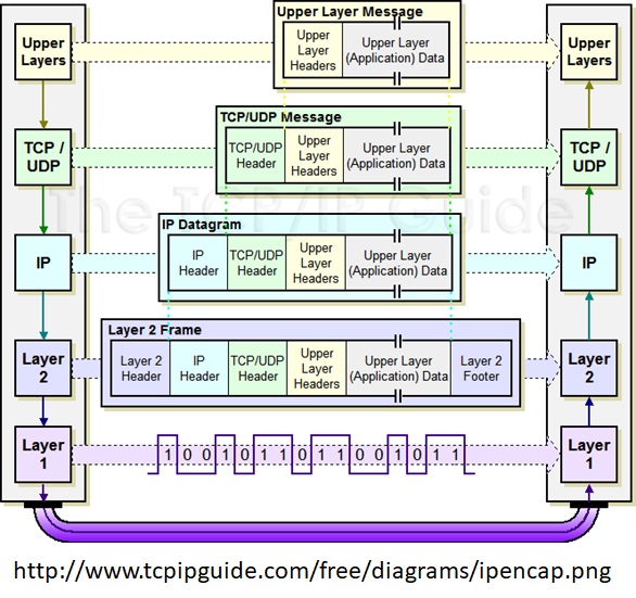 Lorsqu'une application (couche supérieure) doit transmettre un message (des données), elle sollicite les services des couches inférieures. Aux données à transmettre s'ajoutent des en-têtes (headers), et ce à chaque couche afin de gérer le protocole d'échange de données. C'est le processus d'encapsulation.