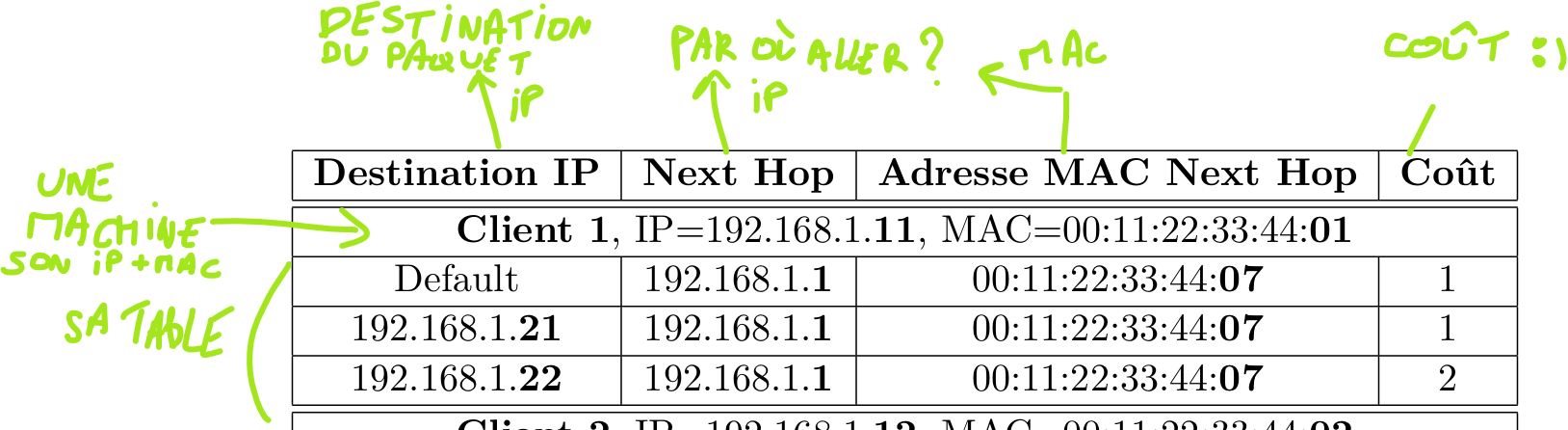 - Pour chaque machine, quelques adresses de destination sont connues, précisant le chemin à emprunter (@IP "Next Hop" et @MAC "Adresse MAC Next Hop).